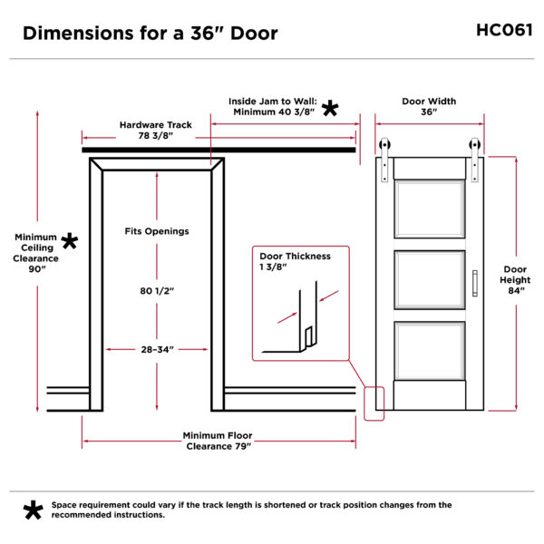 Doors are approx. 4” wider and 4” higher than the door opening. Barn door track length is generally twice the door width.
